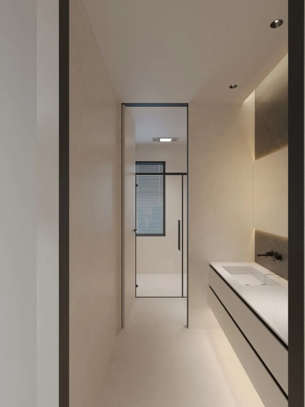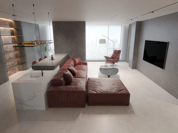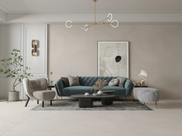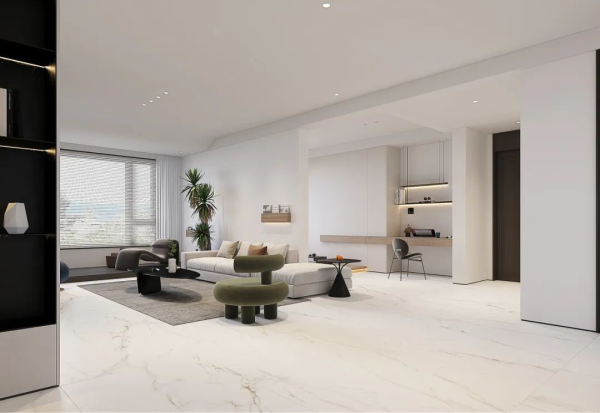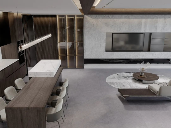 復刻天然洞石的特征,漸變的黃灰色調紋理相互交織,連綿不斷的層次讓空間視覺更具縱深感。