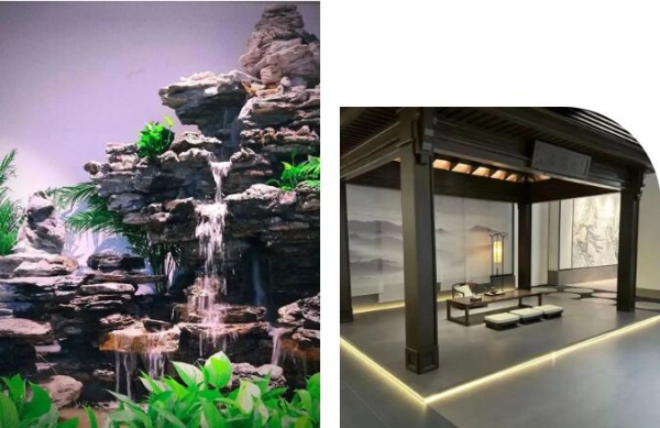 展廳的室外設(shè)計(jì)部分以江南園林為主體,并自然地將山居、涼亭、橋廊、窗洞、流水等融入其中,一派恬靜內(nèi)秀的江南韻味,構(gòu)筑了一個(gè)悠然愜意、自然詩性的現(xiàn)代居住空間。