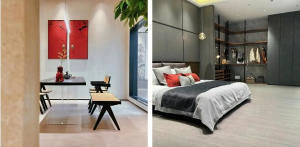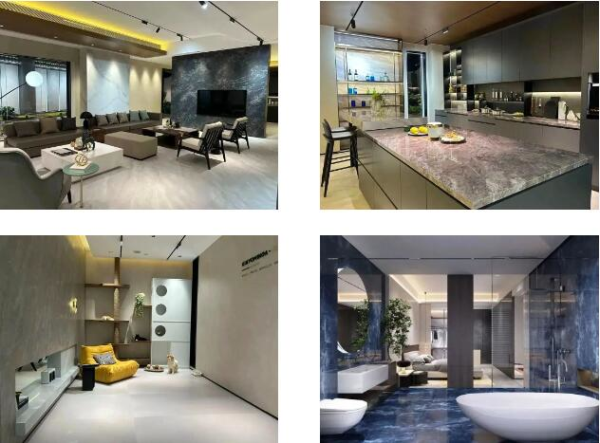場(chǎng)景體驗(yàn)以形塑明晰動(dòng)線,一鏡到底的方式展示,墻體及地面運(yùn)用不同巖板產(chǎn)品,區(qū)隔出客廳、餐廳、廚房、衛(wèi)浴、茶室、寵物房等不同場(chǎng)景,將空間轉(zhuǎn)換消弭于無形,讓觀者沉浸式地體驗(yàn)其中。