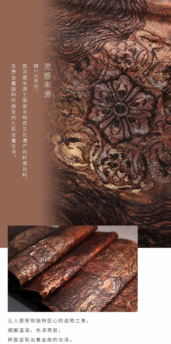 錦2.0系列,以非遺布料作為創作靈感,香云紗是目前世界上現存最古老、最復雜、最傳奇的絲綢面料之一。慕瓷從一塊日本回流到國內的珍貴香云紗布料中,提取了其與眾不同的色澤和花團錦簇的紋理。