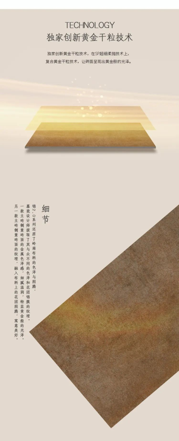 同時,錦2.0系列還榮獲了國家級設計外觀專利,入選佛山石灣政府《NI好 美陶灣》宣傳片的拍攝,自成一格、匠心獨具,讓傳統文化與瓷磚美學延伸出不一樣的生命力,讓人感受到自然變換的造物之美,也突顯傳統文化與現代生活的詩意交融,極具時尚感兼顧實用性,彰顯深厚嶺南文化底蘊,激起了嶺南文化IP風潮。