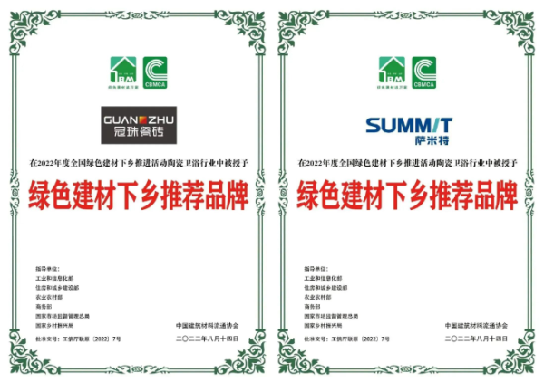 冠珠瓷磚與薩米特榮獲“綠色建材下鄉推薦品牌”