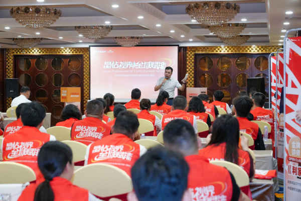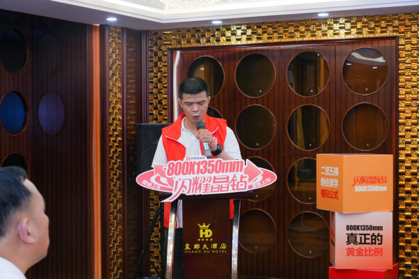 會議上,集團生產部研發經理袁紅健針對《8135新品講解》展開深度剖析,聚焦利家居閃耀晶鉆系列800x1350新品的產品工藝,他梳理出一系列獨具特色的產品賣點,并就產品材質的分析方法進行了細致入微的講解。