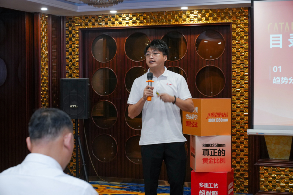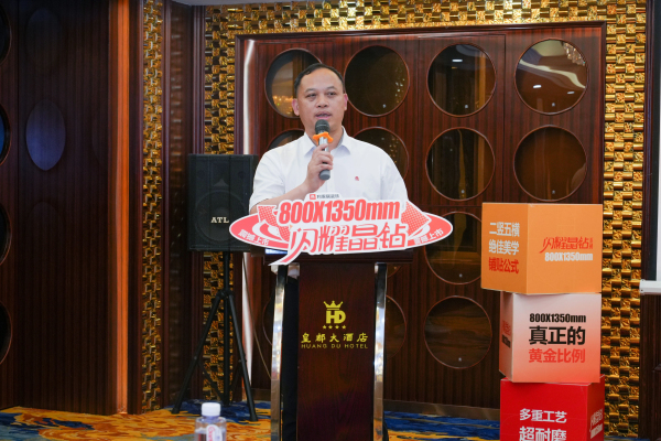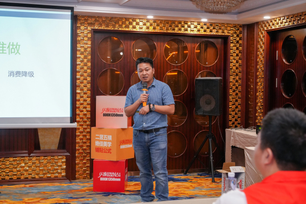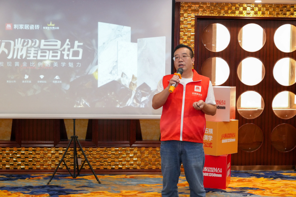 利家居瓷磚營銷總經理陳東榮登臺致辭。他鄭重代表利家居瓷磚,向踴躍參與潮南區域交流會的經銷商們致以誠摯謝意。隨后,他清晰闡述了此次潮南交流會的核心目的,期望在座的各位經銷商能夠打破固有思維局限,以專注認真的態度學習,深入剖析優秀門店的成功經驗,用心汲取運營經驗及產品知識表達,并切實做到將所學知識靈活運用到實際經營中。