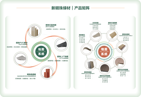 產品矩陣龐大。地面系統產品包含“石晶地板、LVT地板、PVC卷材、明珠棧道板”,墻面系統產品包含“生態軟瓷、明珠柔石、石晶墻板、硅晶板、雪晶板、生態飾面板、生態快裝板”,為家居空間、商業場所、醫養領域等提供一站式整體空間解決方案。