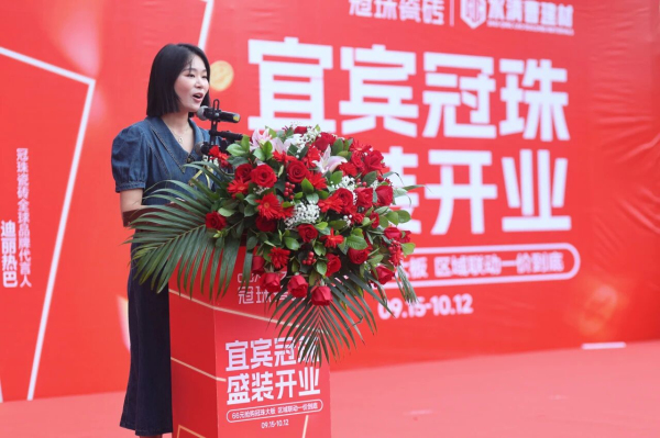曹建材商貿有限公司副總經理、宜賓冠珠瓷磚總經理曹海祥發表致辭。她表示,宜賓冠珠擁有一支專業且高素質的服務團隊,致力于為宜賓市民提供全方位、貼心、便捷的精細化服務,相信依托冠珠瓷磚強大的品牌力及高標準服務體系,宜賓冠珠定能助力業主朋友們,打造一個滿意、放心、美好的家。