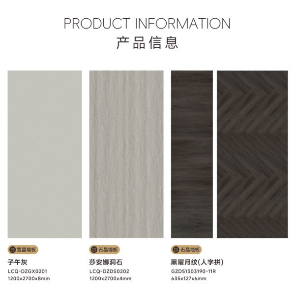 項目主材:石晶地板(黑曜月紋-人字拼)、石晶墻板(莎安娜洞石)、雪晶墻板(子午灰)