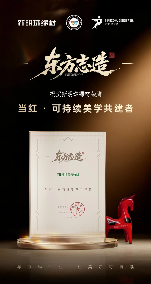 作為計劃的重要合作伙伴,新明珠綠材在授牌儀式中榮膺“當紅•可持續美學共建者”稱號,體現了品牌在新材料領域的可持續實踐與美學創新獲得了文化創意領域的高度認可。