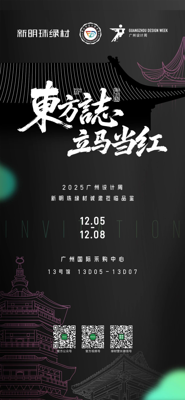 2025年12月5日,廣州設計周在廣州盛大啟幕,全球設計力量與前沿思潮在此交匯。在眾多精彩展覽中,由新明珠綠材深度參與共創的「東方誌」主題展館尤為引人注目,成為全場打卡熱點。