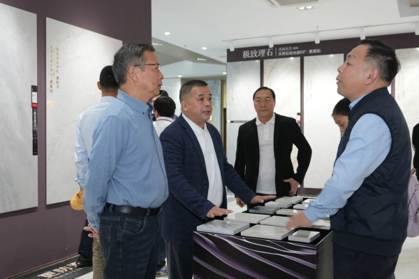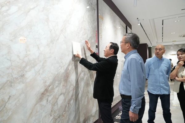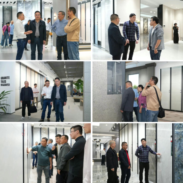 考察團在展廳詳細了解了能強瓷磚產品體系,從逼真還原天然肌理的木紋磚,到融合七彩結晶工藝的彩晶大理石,再到具備超強防污性能的珍珠絨柔光磚。