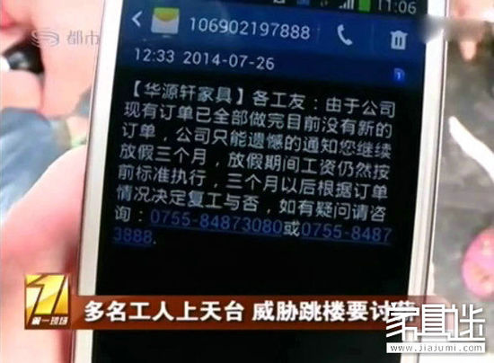 7月26日,華源軒家具的工人又收到短信,稱由于公司現(xiàn)有訂單已全部做完,目前沒有新的訂單,只能繼續(xù)放假3個月,放假期間工資仍然按前標(biāo)準(zhǔn)執(zhí)行,3個月后根據(jù)訂單情況決定復(fù)工與否。