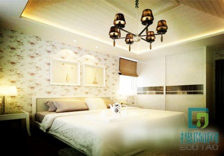 這一款婚房選用了碎花墻紙,帶來了田園浪漫氣息,同時它六邊形型的塔狀吊頂配以金屬制做舊吊燈,有注入了歐式風情。造型簡單一致的床頭柜與床極力打造了空間的靈動感。白色樺木衣柜木色紋理十分清晰,中間加上銀色鏡面腰線讓衣柜更為時尚。