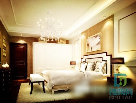 金色除了彰顯室內的富麗堂皇,還體現了主人對于歐式古典的偏愛。金色的描邊和金色的床頭柜拉手都在默默吐露古典氣息。而一件純白衣柜在臥室里則顯得分外清新。首先,在造型上沒有多做變化,以最普通的裝飾藝術來打造簡約感。
