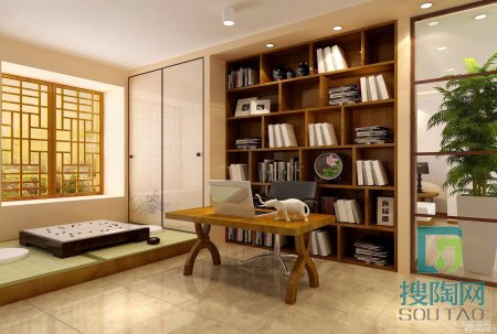 能夠在書房接納客人的設計可以參考上圖,單面墻的書柜旁邊設計一個小炕,也可以換成沙發或者椅子和圓桌,看書之余和朋友談笑風生,莫不快哉!