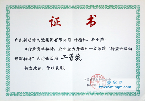 2015年2月在《中國建材報》及《中國建材》雜志上以中國建材聯合會會長喬龍德題為《轉型快慢取決于覺悟早晚》的訪談作為開篇,正式拉開大討論的序幕。“轉型升級向縱深轉折”大討論活動歷時9個月,在建材行業中掀起了轉型升級的討論熱潮。最近由中國建材聯合會主辦“首屆中國建材業年度經濟論壇”在北京隆重舉行。新明珠集團喜獲中國建材聯合會會《轉型升級向縱深轉折》“大討論”活動二等獎。