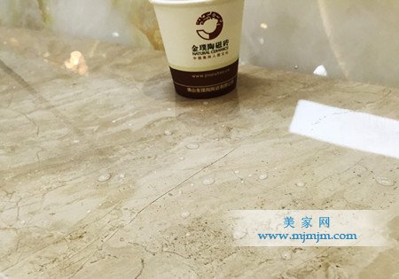 防滑性能差會使家居安全有潛在的安全隱患。下面就讓美家測評員來測試一下這款鉑晶大理石瓷磚的防滑性,我們現在傾斜的瓷磚表面上灑滿水,然后把一個裝滿水,然后把一個裝滿水的杯子立在上面,觀察幾分鐘,發現杯子并沒有在瓷磚上出現滑行的現象。說明這款鉑晶大理石瓷磚防滑性能是經得起考驗的。