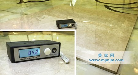 光澤度高的瓷磚對于空間的裝飾效果會比普通的瓷磚要好,金璞陶大理石采用超平拋、超潔亮雙U+工藝,使得質面平整高亮。美家測評員用光澤度儀器測試鉑晶大理石光澤度為84左右,鉑晶大理石瓷磚擁有最真實的石材光感。