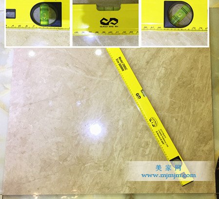下面我們來看看這款大理石磚的平整性,小編把水平尺放在瓷磚表面,根據斜角放置的水平尺顯示,三個不同位置的水珠都處于平整狀態。結果說明了這款瓷磚的平整性能很好。