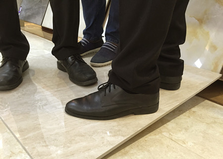 瓷磚的抗壓性指的是瓷磚的破壞程度?箟盒阅懿,容易導致瓷磚在使用時出現開裂、斷裂等現象,也影響美觀。測評員把瓷磚一邊傾斜,并讓3為的男性工作人員站上去,瓷磚沒有出現開裂的現象。說明鉑晶大理石的抗壓性非常好。