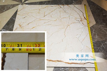 下面我們來看看這款金剛釉大理石(索菲特金)的抗壓性能如何,首先請現場工作人員把瓷磚抬高15公分左右形成斜面。請現場2位成年人站立于瓷磚上,結果瓷磚堅硬如常,沒有出現任何的裂紋。消費者們可以放心購買。