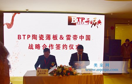 開(kāi)業(yè)慶典上,BTP陶瓷薄板送出一個(gè)重磅的消息,與瓷磚膠知名品牌雷帝國(guó)際達(dá)成戰(zhàn)略已合作,并在眾多媒體和嘉賓的見(jiàn)證下簽署了合作協(xié)議。據(jù)了解,雷帝是世界上薄板、瓷磚和石材安裝系統(tǒng)歷史悠久的化學(xué)建材專(zhuān)業(yè)生產(chǎn)企業(yè),其總部位于美國(guó)康尼狄格州,在美國(guó)有12個(gè)生產(chǎn)基地,與雷帝簽署戰(zhàn)略合作協(xié)議,必將為BTP陶瓷薄板品牌的發(fā)展和市場(chǎng)服務(wù)帶來(lái)更大助力,也為展廳的盛大開(kāi)業(yè)畫(huà)上了圓滿(mǎn)的句號(hào)。