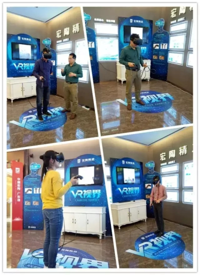 宏陶720°VR實景體驗區設立于總部展廳文化區內,帶上VR眼鏡后,你可以身臨其境般的感受新家裝修實景,不僅僅是簡單的看平面效果圖,你可以在其中走動,感受3D效果,可以開門進入客廳、廚房、書房、衛生間等空間,甚至可以打開房間里面的電視、空調、冰箱等,且可以根據自己的喜好更換瓷磚,讓裝修更加生動有趣。