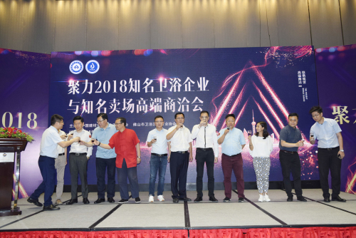 聽著臺上賣場代表們激情洋溢的介紹,臺下衛浴企業代表們的臉上寫滿期待,賣場企業介紹完畢,商洽會進入嘉賓祝酒環節,中國建材市場協會衛浴分會、佛山市衛浴潔具行業協會秘書長劉文貴先生及各賣場代表上臺一起祝酒。