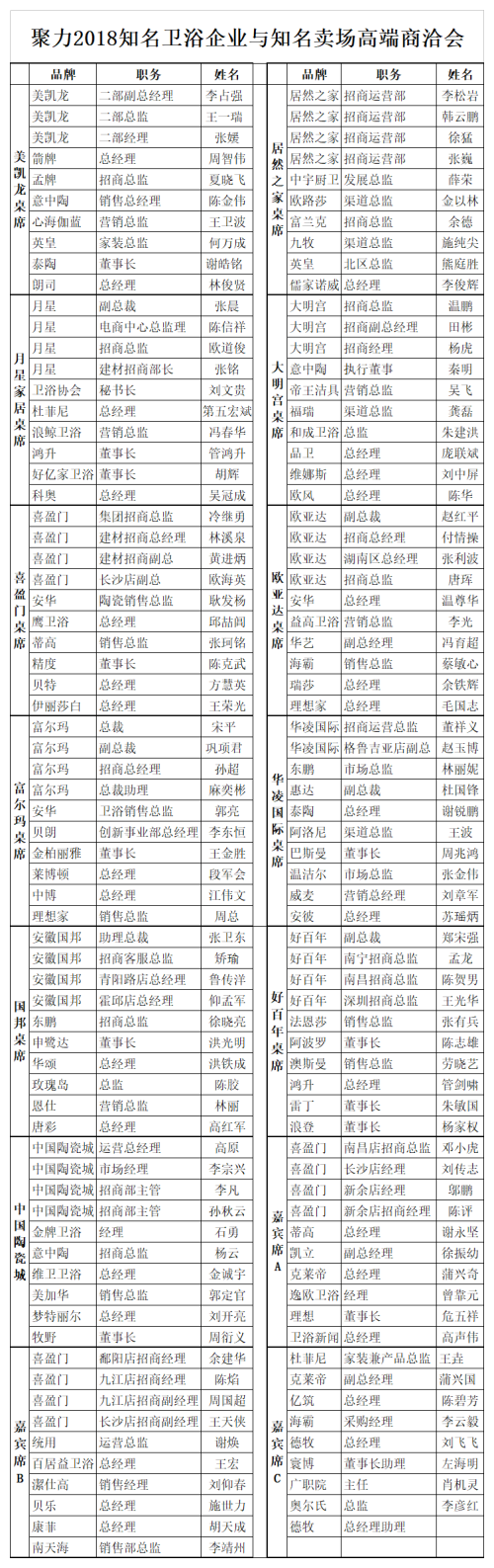 6月6日,由中國建材市場協會衛浴分會、佛山市衛浴潔具行業協會主辦的知名衛浴企業與知名賣場高端商洽會在上海浦東新區證大美爵酒店舉行。中國建材市場協會衛浴分會、佛山市衛浴潔具行業協會邀請到國內知名衛浴品牌九牧、箭牌、恒潔、惠達等近百家企業與紅星美凱龍、月星家居、西安大明宮、青島富爾瑪、武漢歐亞達、居然之家、新疆華凌、上海喜盈門、安徽國邦、好百年、中國陶瓷城十一家知名賣場,幾十位知名賣場高管進行了面對面交流。