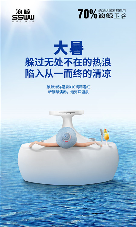 夏末大暑,浪鯨浴缸讓你樂不思暑 大暑,夏季最后一個節氣。 中伏前后,暑氣正盛 萬物華實,大雨時行 如何躲過火辣辣的熱浪, 是大家在夏天永恒不變的話題, 海洋的清涼舒爽則最讓人心向神往。 浪鯨海洋溫泉X10鋼琴浴缸 讓你無需再冒著“下餃子”的風險, 只需隨著美妙的鋼琴演奏, 愉悅地陷入從一而終的清涼, 就能擁有一整片專屬自己的海洋。 浪鯨海洋溫泉X10鋼琴浴缸, 弧型設計的裙邊線條走勢柔軟而富有藝術感, 一個生動的鯨魚翹尾形狀十分討人喜歡。 當你放松身心暢快地享受泡澡時, 宛如化身成為一條優雅的美人魚, 舒適地在浩瀚的海洋上徜徉。 這款浴缸屬于多功能的按摩浴缸, 浴缸的缸底、側壁上,設有多個按摩噴頭。 同時浴缸還具有水溫恒定的功能, 夏季泡澡水溫應調試到溫暖為適宜, 當水溫控制在一定溫度時, 加上浴缸的沖浪按摩功能, 讓你在家也能感受到從身體到靈魂的全新享受。 小暑大暑, 浪鯨海洋溫泉X10鋼琴浴缸 帶你躲過無處不在的熱浪, 優雅地陷入從一而終的清涼, 讓你整個夏季樂不思暑。