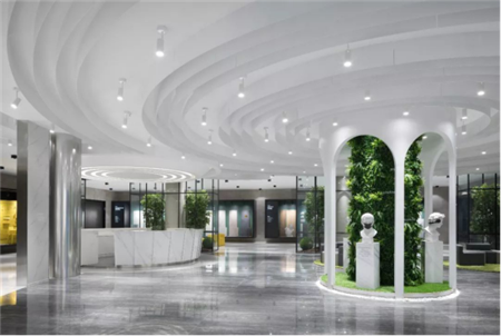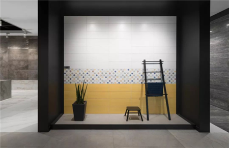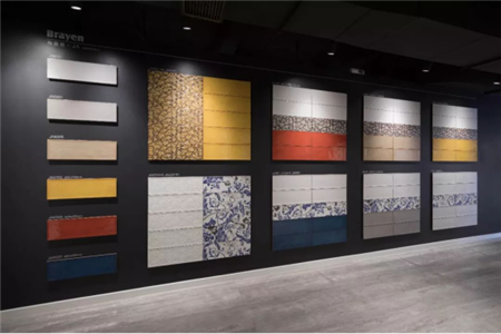 芒果瓷磚崇尚自然的綠植元素,其中也糅合了從田園到莊園,不同風格、質感、色彩的混合展示,這一點在二樓展示終端的展廳里詮釋更充分。
