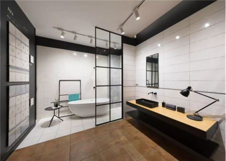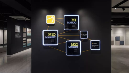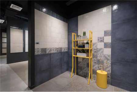 二樓是終端體驗館,主要以產品的空間搭配應用進行設計,展現的是終端展廳的空間設計模板,已經元素的運用。近30個樣板間,囊括了近幾年市場上風靡流行的室內裝修風格,芒果瓷磚攜有設計的產品,為越來越多的年輕設計師提供設計元素。