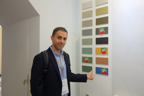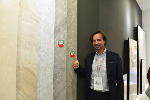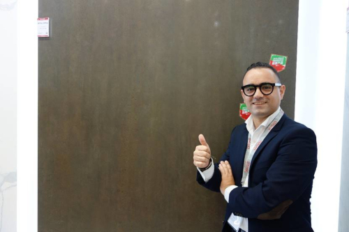 設計師ROBERTO DI STEFANO了解了諾貝爾瓷磚產品后,對諾貝爾展出的其中一款大板瓷拋磚比較喜歡。他表示,諾貝爾的金屬咖色的大板很特別,非常適合現代設計。