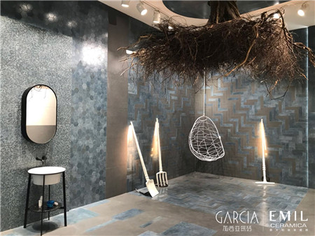 這是最具設計力的一個藍色空間,其產品富含系統性以及多樣性,除了色調上的差異,還包括了亮/啞面、平面/模具凹凸面等多種工藝,質感細膩;空間中運用了木紋加水泥的設計,靜謐色調的墻磚搭配,工藝獨特,顏色豐富。不難理解,EMIL展會可以瞬間成為全場的焦點,同時加西亞集團董事總經理柯顯仁先生亦為其代言。