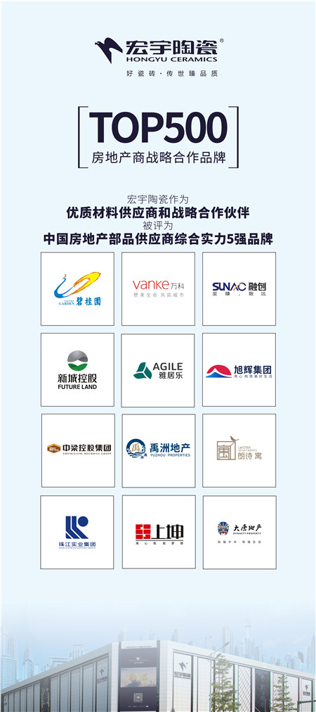 宏宇陶瓷匠心質造21年,贏得了眾多著名房地產企業的青睞。目前,宏宇已與碧桂園、融創中國、新城控股、雅居樂等眾多地產行業龍頭企業達成長期戰略合作。宏宇馳譽海內外,產品得到眾多百強房企認可與信賴,是全國眾多百強房地產商的戰略合作伙伴和優質材料供應商。