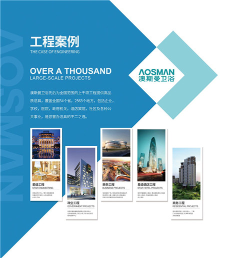 澳斯曼簡介:澳斯曼衛浴在廣東擁有四大生產基地,產品涵蓋陶瓷潔具、休閑潔具、浴室家具、五金龍頭、衛浴配件等衛生潔具領域,經過近20年發展,澳斯曼團隊已達兩千多人,終端網點已經遍布全國各地,并已和多個世界知名品牌建立了重要戰略合作伙伴關系。