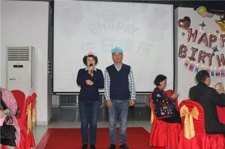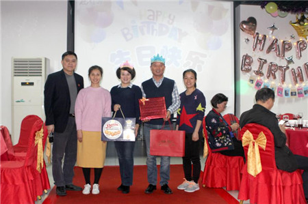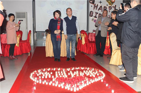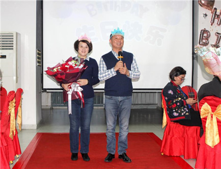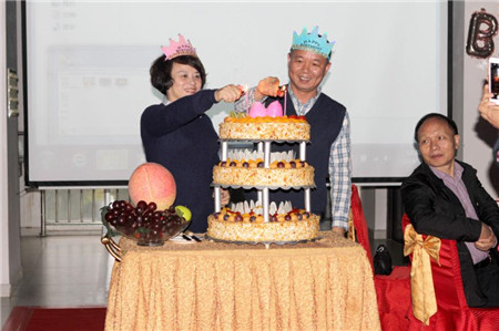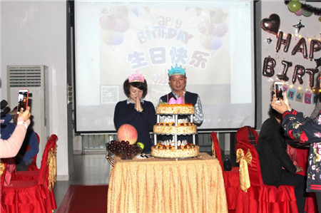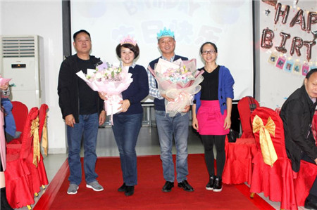 公司同事給廖董事長、普副董事長獻花送禮,祝愿笑口常開,幸福安康。